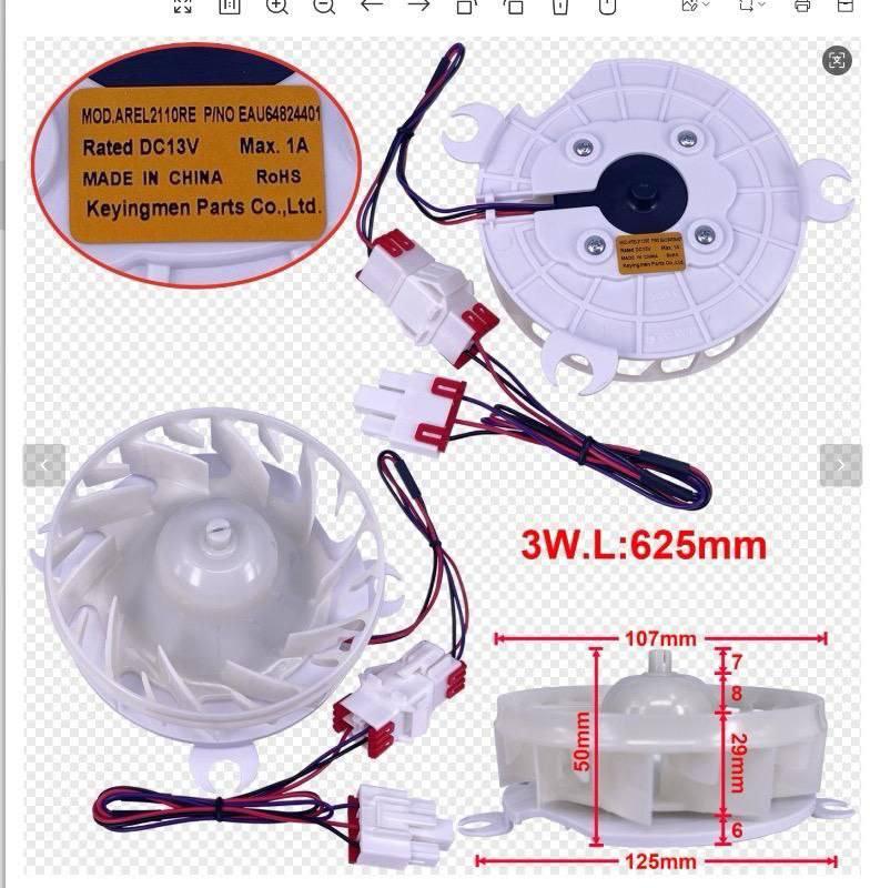 فن توربینی ۳ سیم الجی مدل EAU64824401 یکی از قطعات اصلی در سیستم گردش هوای یخچالهای ساید بای ساید LG است. این فن با ولتاژ ورودی ۱۳ ولت DC طراحی شده و به دلیل دارا بودن ۳ سیم (سهفیش)، کنترل دقیقتری روی سرعت چرخش، عملکرد نرم و ایجاد سرمای یکنواخت در کابین یخچال و فریزر دارد.